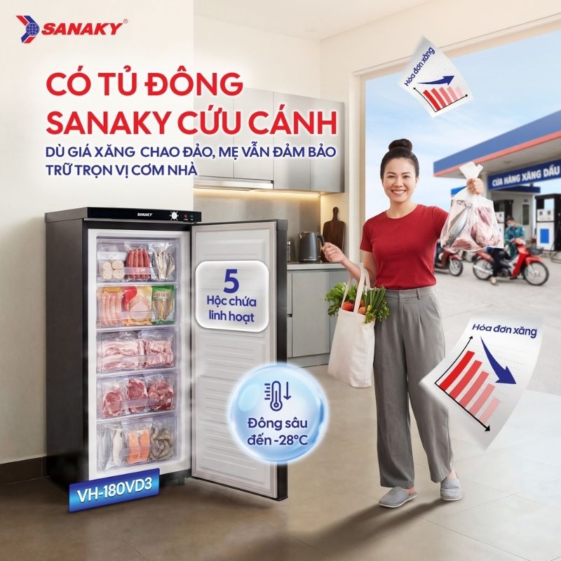 Câu trả lời nằm ở việc trữ thực phẩm thông minh với tủ đông hãng Sanaky dạng đứng.