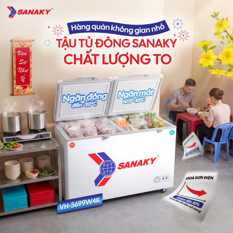 Giải pháp đơn giản và dễ áp dụng nhất là dùng tủ đông 2 ngăn Sanaky: vừa có ngăn mát để giữ rau củ/đồ uống, vừa có ngăn đông để trữ thịt cá, hàng đông lạnh. Trong nhóm dung tích vừa, Sanaky VH-5699W4K (560 lít) là lựa chọn hợp cho quán nhỏ vì không quá to, dễ dùng, nhưng vẫn “đủ lực” để trữ hàng bài bản.